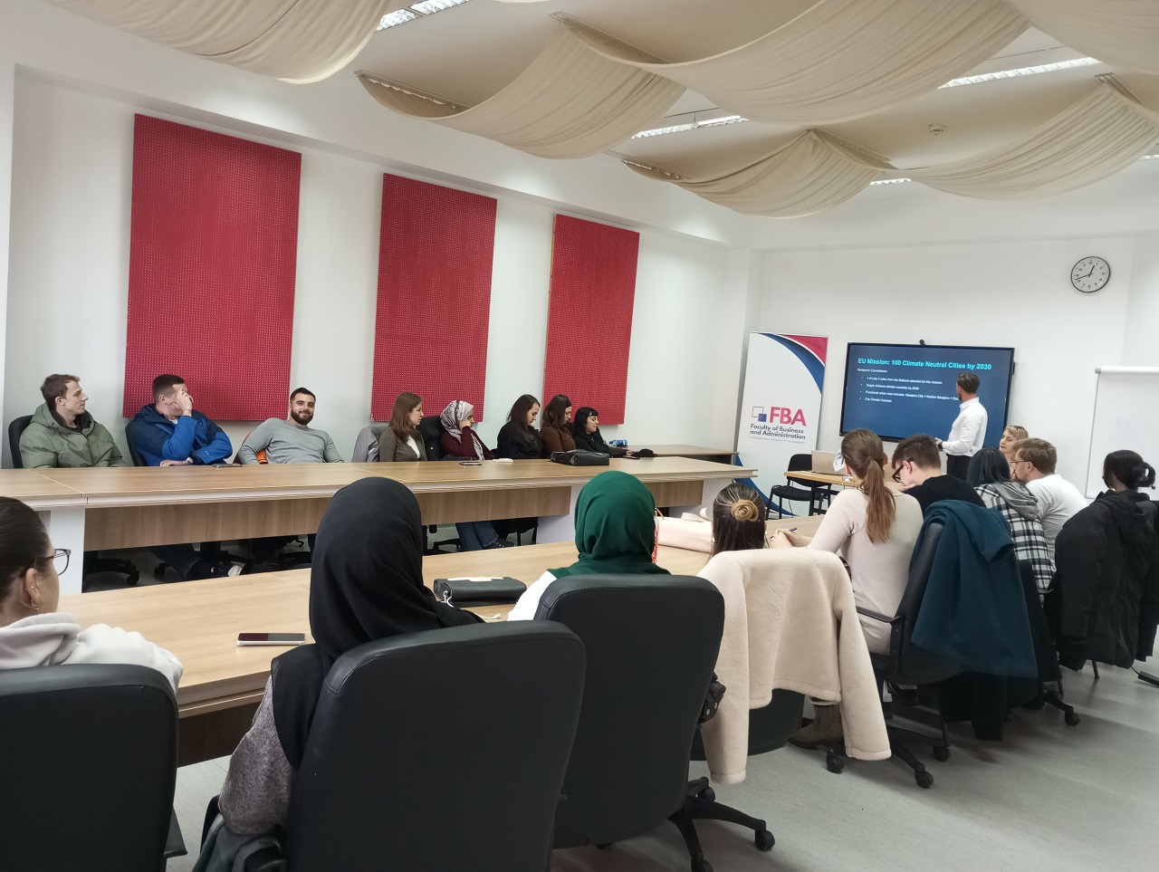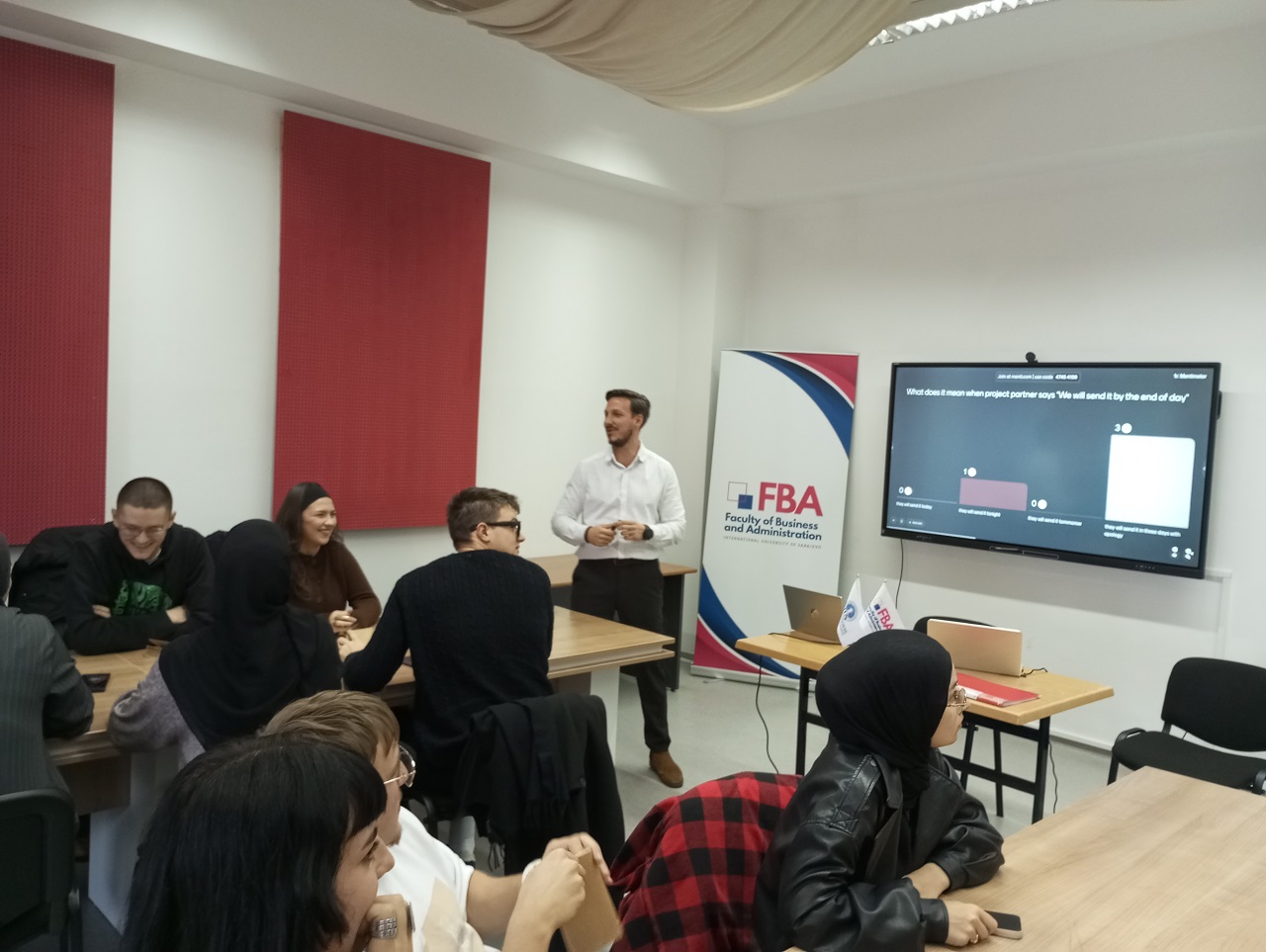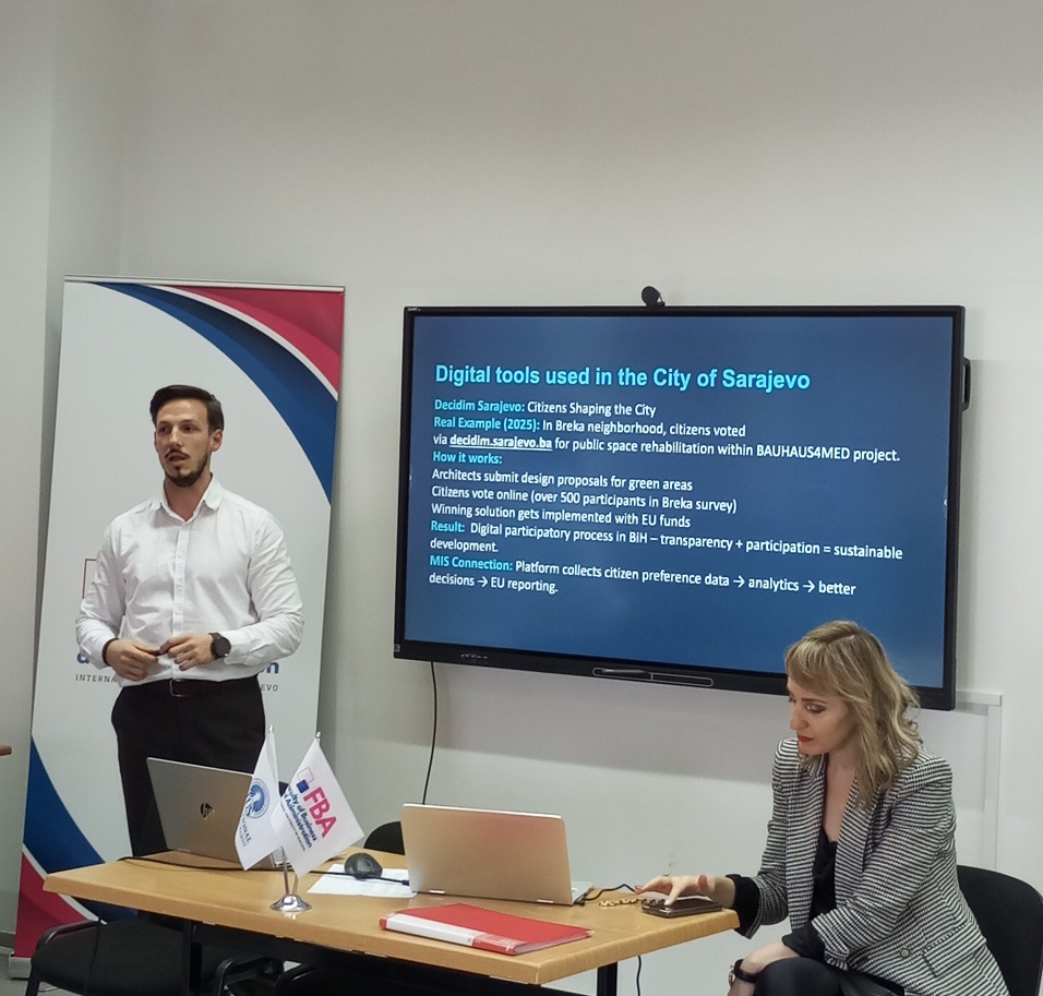 Fakultet menadžmenta i javne uprave (FBA) je organizovao predavanje posvećeno ulozi digitalnih alata u podršci održivom razvoju i jačanju participativnog upravljanja u Gradu Sarajevu. Predavanje su održali predstavnici Ureda za održivi razvoj Grada Sarajeva – Velida Mehić, Amar Popara i Dženisa Abdulai – koji su studentima predstavili ključne digitalne sisteme koje koriste u svakodnevnom radu.