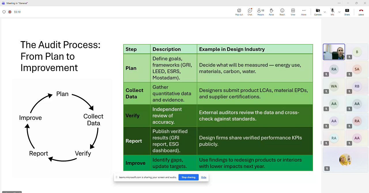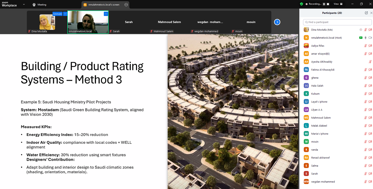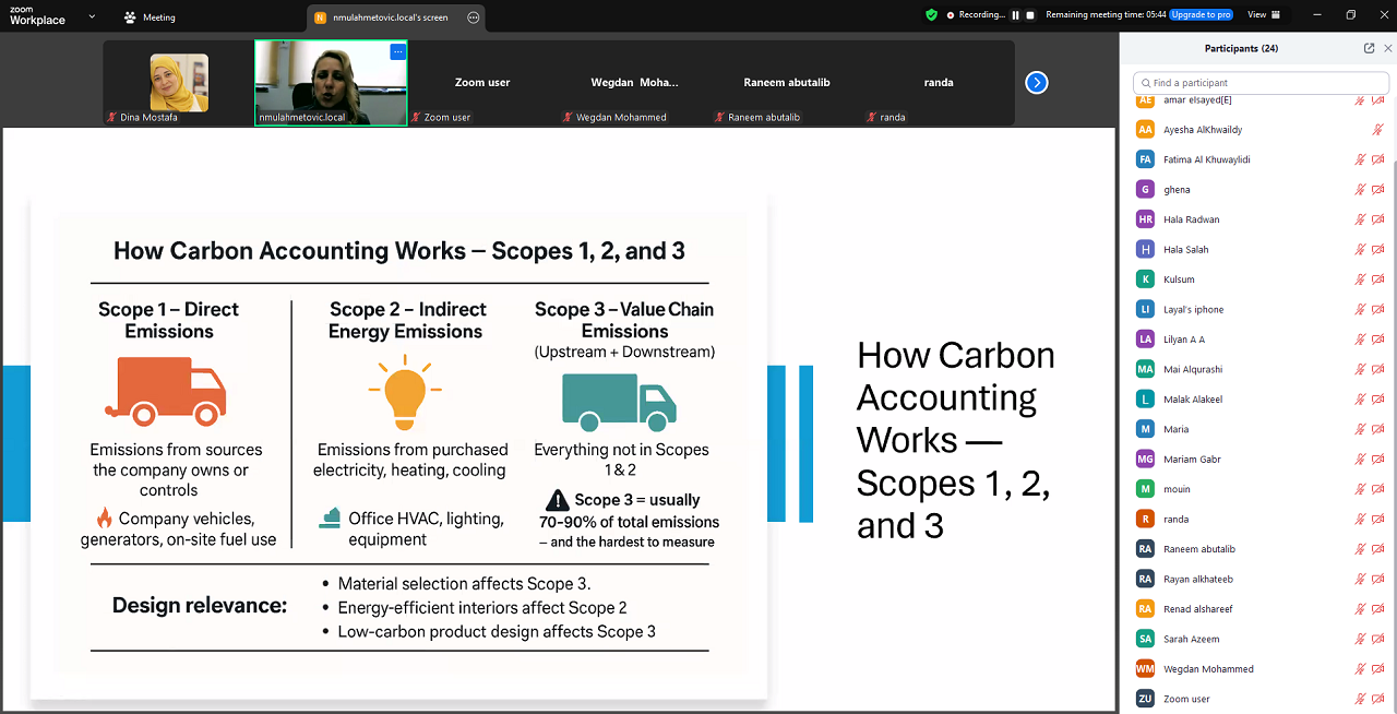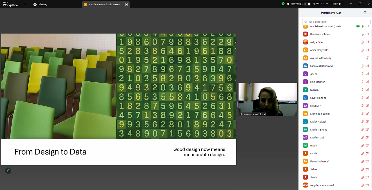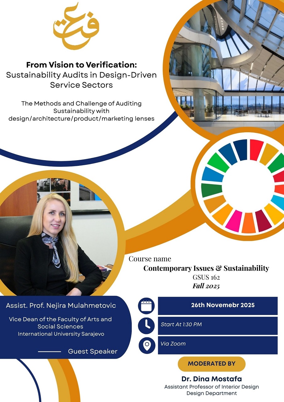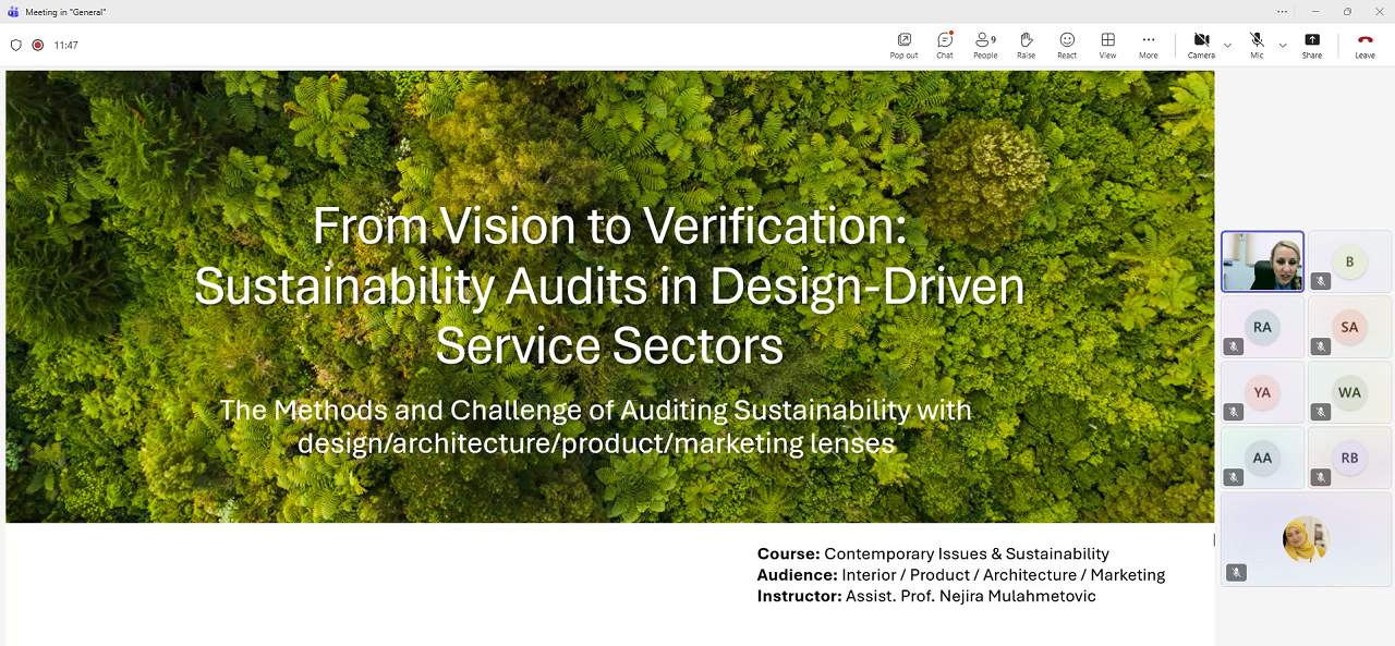 U okviru dva predmeta – Contemporary Issues & Sustainability (GSUS 162) i Contemporary Issues in Design (DESN 431) – dr. Mulahmetović održala je predavanja pod nazivom „Od vizije do verifikacije: revizije održivosti u dizajnerski orijentiranim uslužnim sektorima”. Tokom izlaganja govorila je o načinima mjerenja, provjere i komunikacije održivosti u oblastima arhitekture, dizajna, razvoja proizvoda, dizajna enterijera i marketinga. Studentima je predstavila globalne okvire održivosti, izazove revizije, obračun ugljičnog otiska, značaj kulturnog konteksta te etiku u dizajnu, nudeći sveobuhvatan uvid u savremene prakse održivog razvoja.