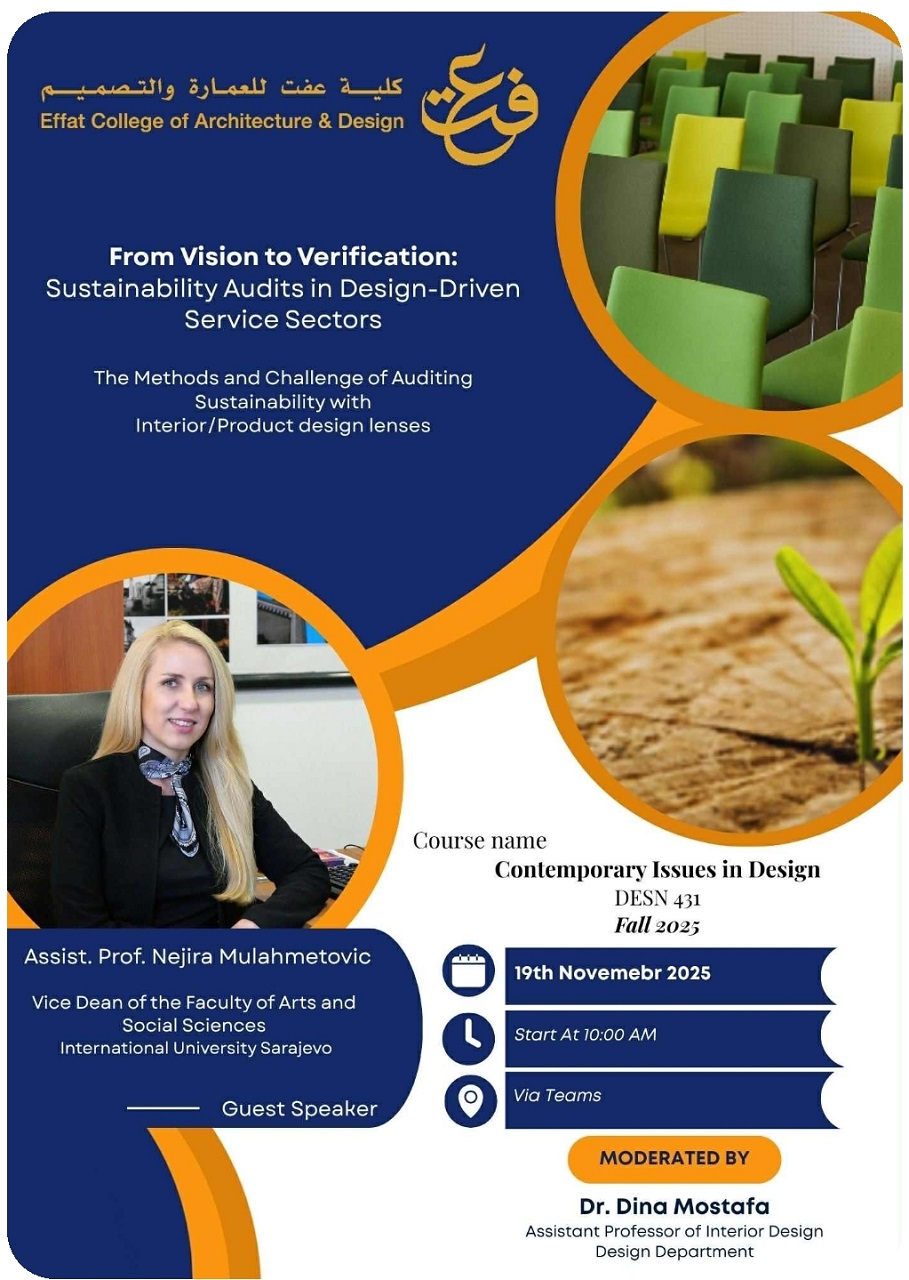 U srijedu, 26. novembra 2025. godine, doc. Nejira Mulahmetović, MA, prodekanesa Fakulteta umjetnosti i društvenih nauka (FASS) i profesorica na studijskom programu Vizualne umjetnosti i dizajn vizualnih komunikacija (VACD), održala je predavanja na Univerzitetu Effat – College of Architecture & Design u Džeddi, Kraljevina Saudijska Arabija.